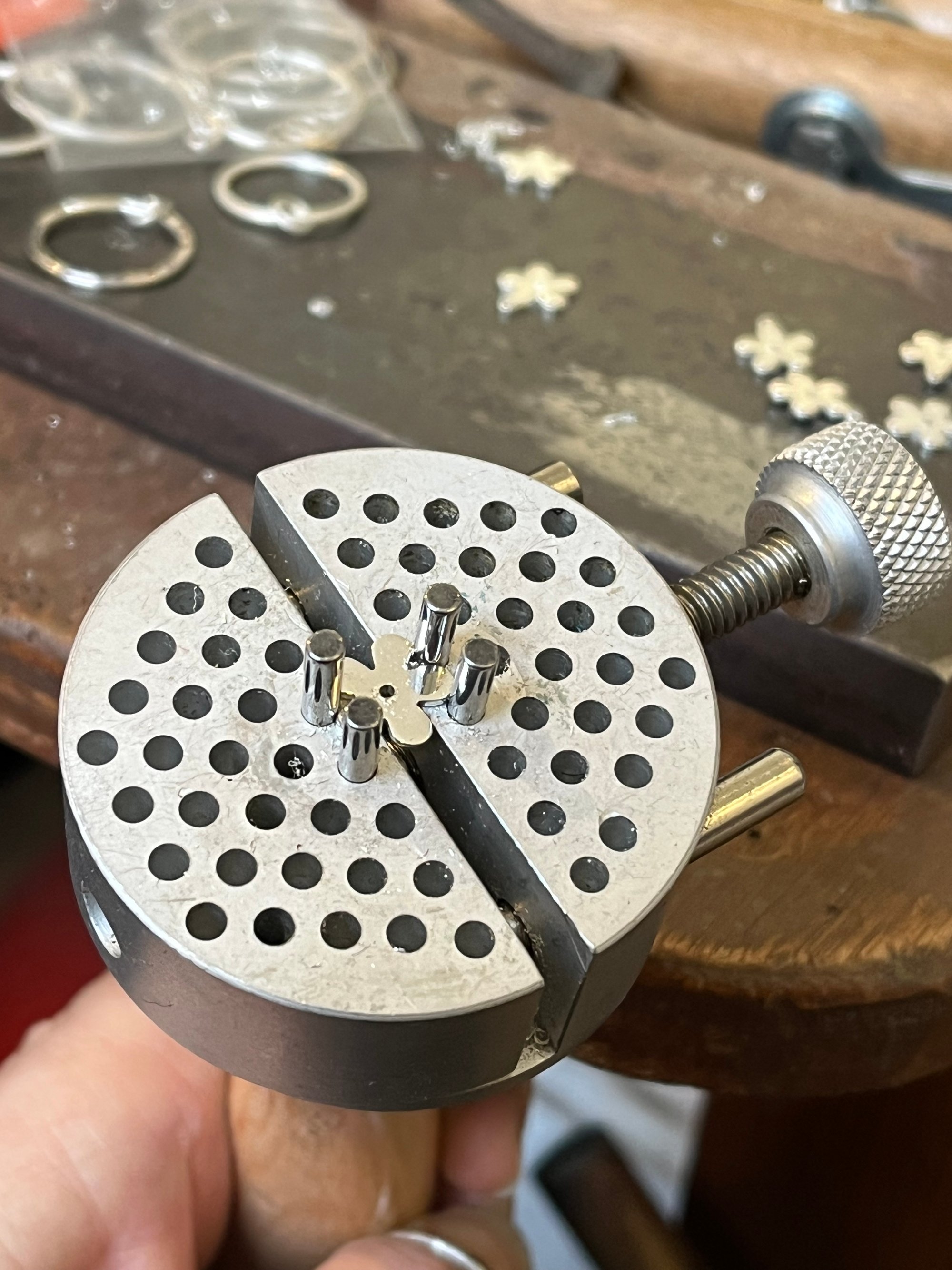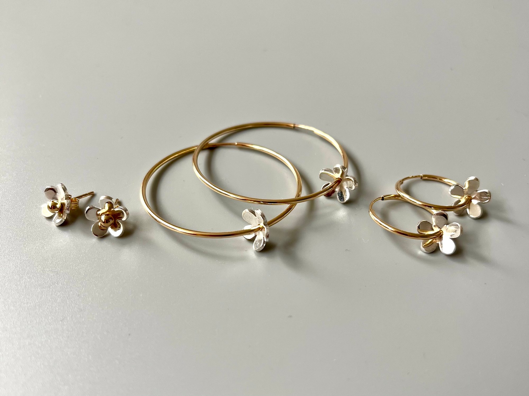 10mm silver curved flower with filled gold ball stud earrings through the centre. (Filled gold is like plated but is a thicker layer of gold). Also shown here with the silver centre option.
